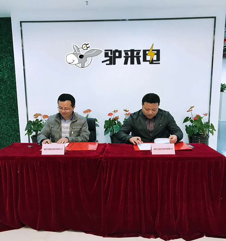 熱烈慶祝福建驢來電新能源科技有限公司與福建龍福機電市場就“驢來電”充電站成功簽約! 2017年11月22日,福建龍福機電副總何萬芬、運營總監黃巍偉蒞臨福建驢來電新能源科技有限公司商談“驢來電”充電站合作事宜并成功舉行了簽約儀式。